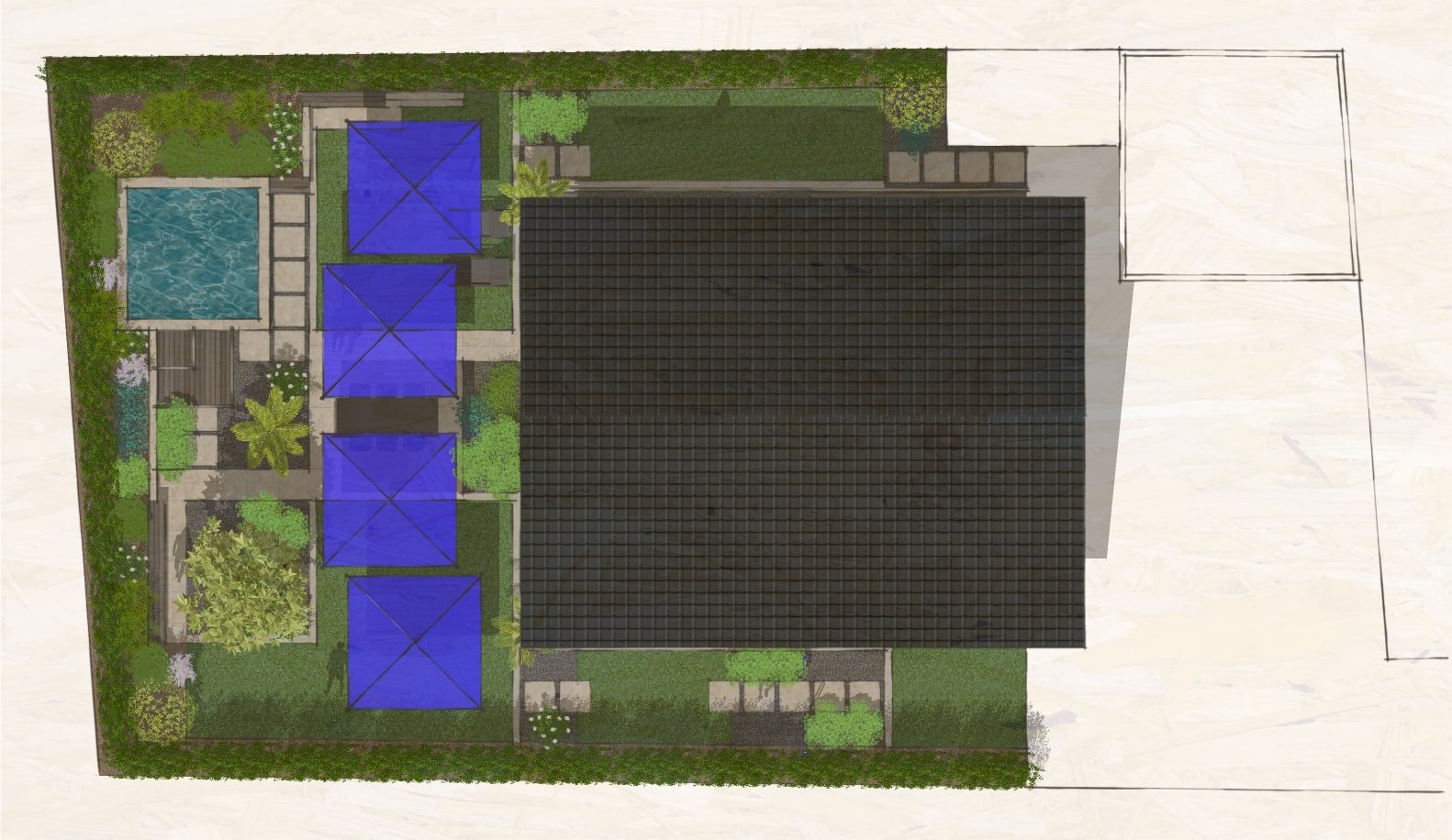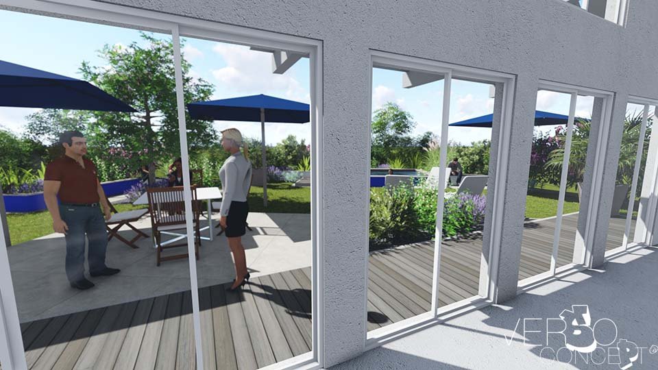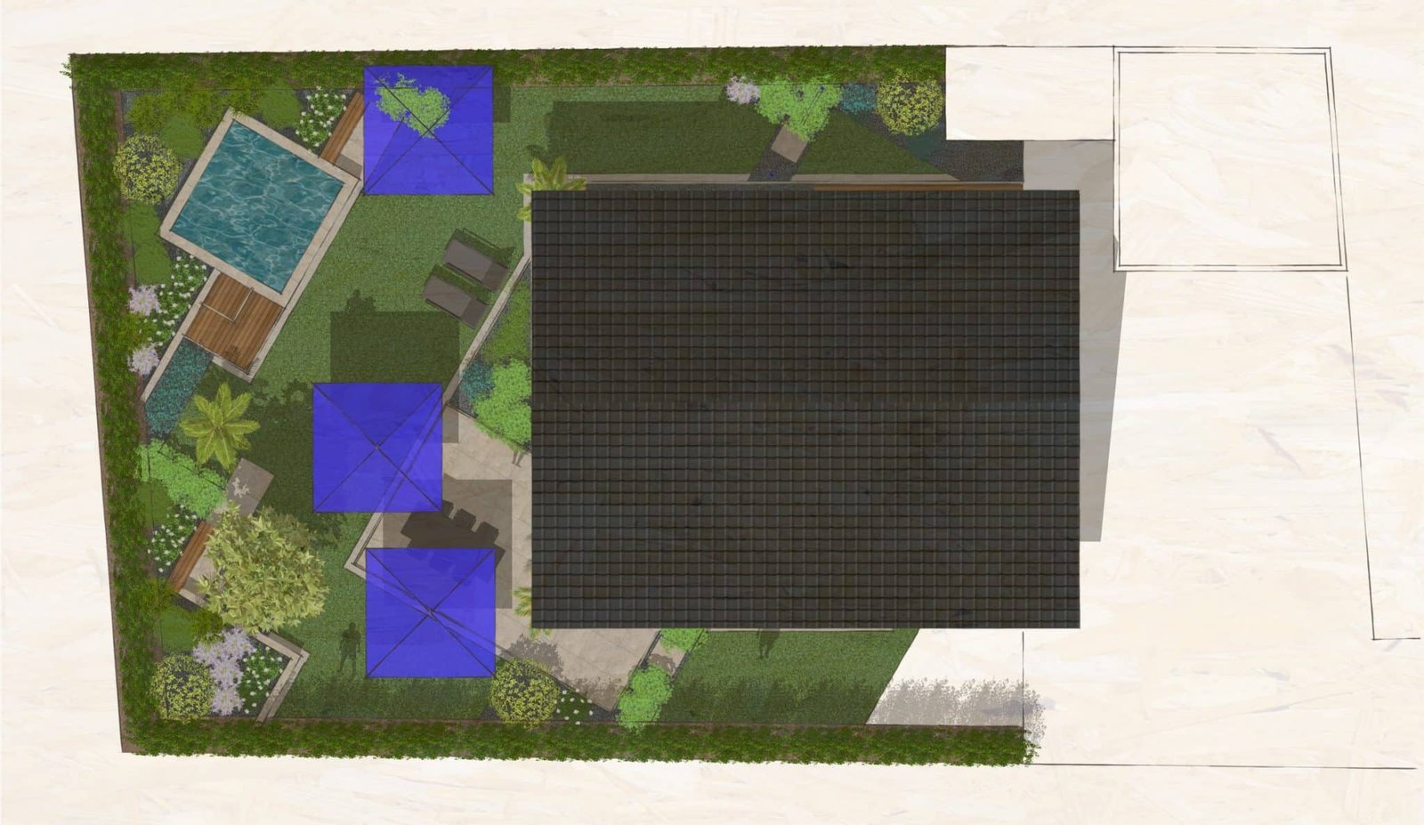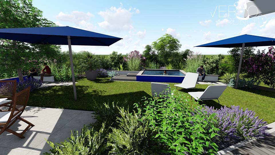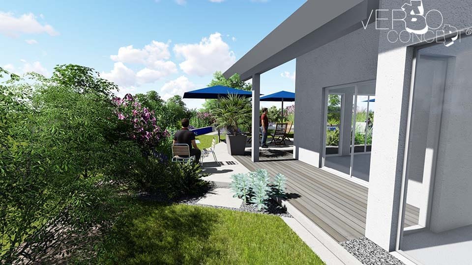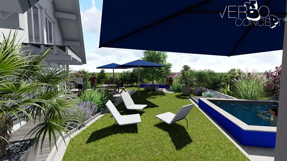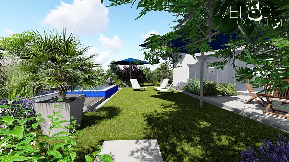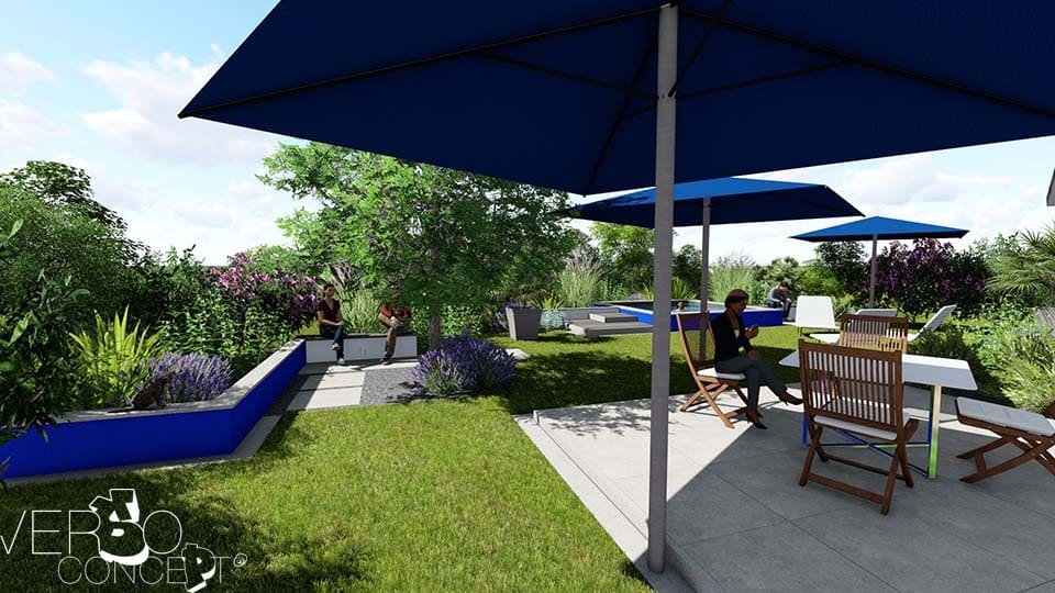 L'objectif de ce projet est de structurer l'espace en intégrant les éléments souhaités tels qu'un bassin fraîcheur, une terrasse et un environnement végétal renforcé. Le complément est une réflexion sur un système d'ombrage cohérent avec l'exposition au vent et les surfaces de vie.