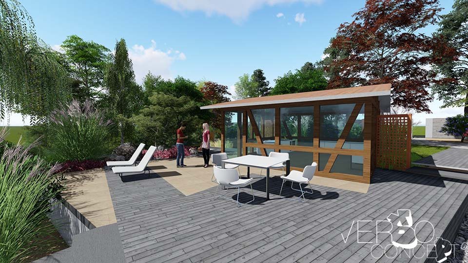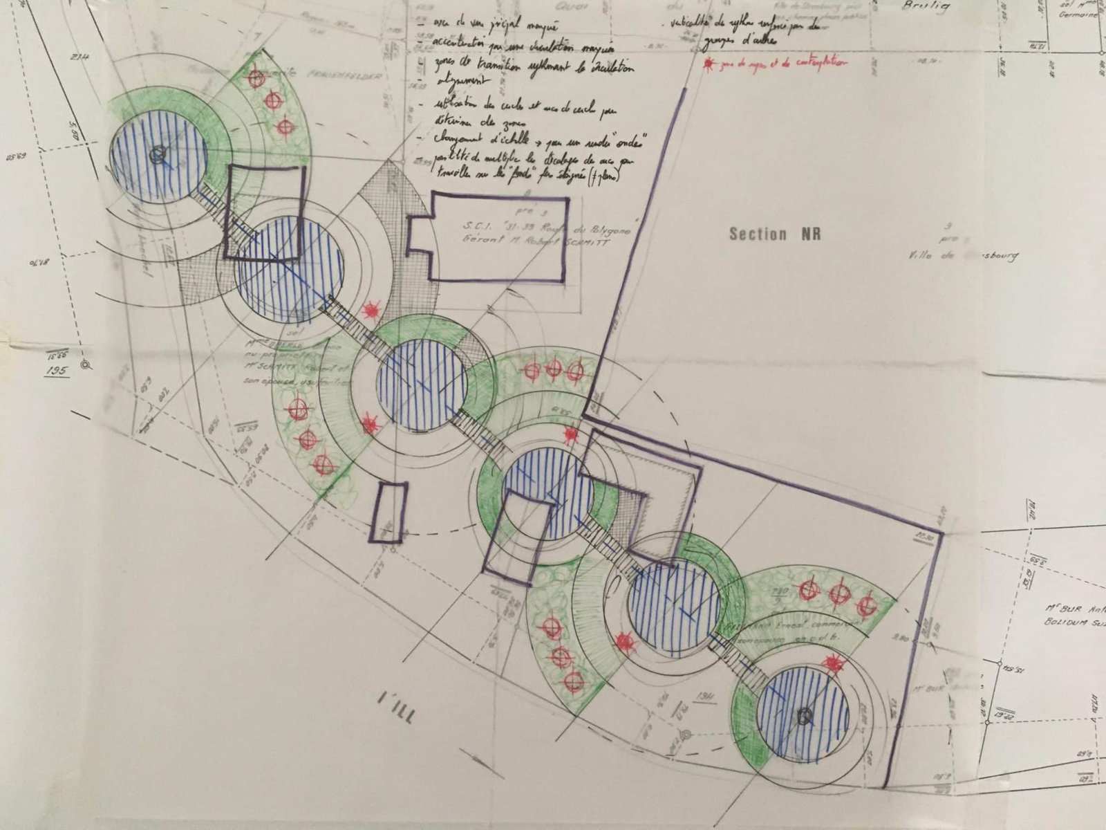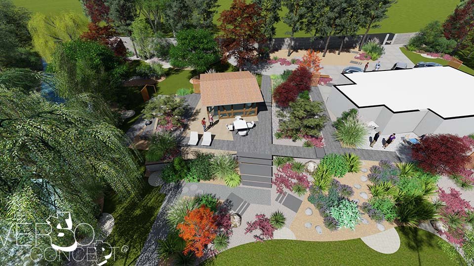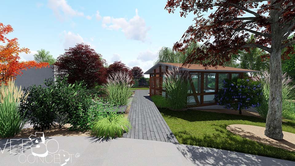 Structurer l'espace autour de l'axe menant de la zone de vie principale du jardin vers le point perspectif. Utiliser les cercles en répétition et créer des ondulations autour. Perspective marquée et intensifiée.