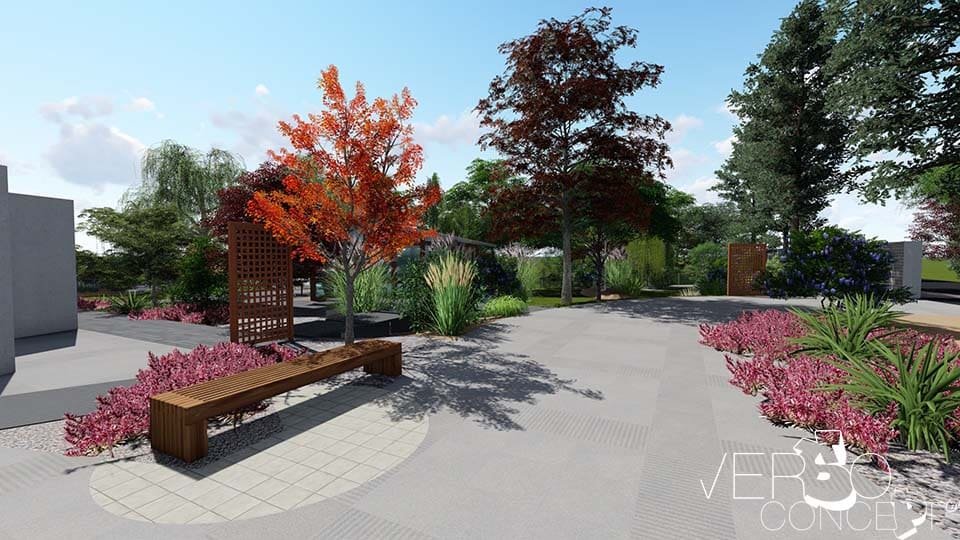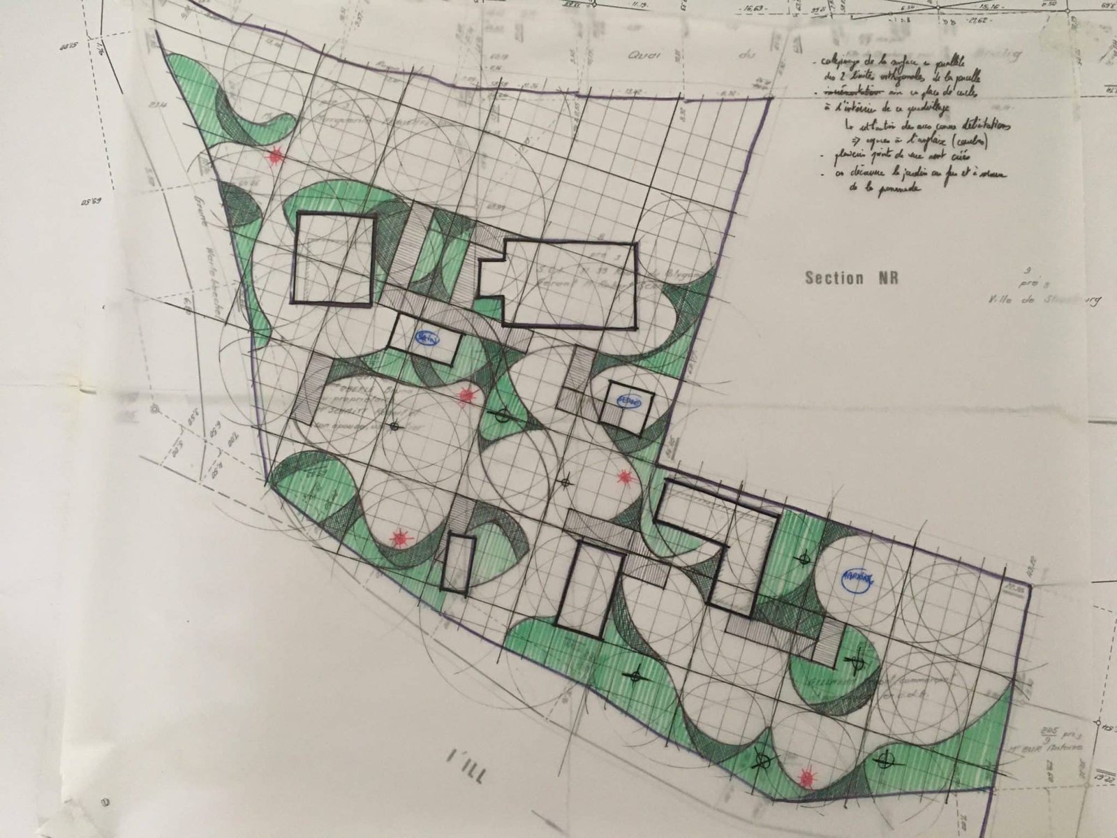 Définir les espaces à l'aide d'un quadrillage axé sur la perspective principale. Travail des limites de zones en courbes pour apporter de la rondeur, de la fluidité visuelle. Mise en place d'espaces de contemplation.