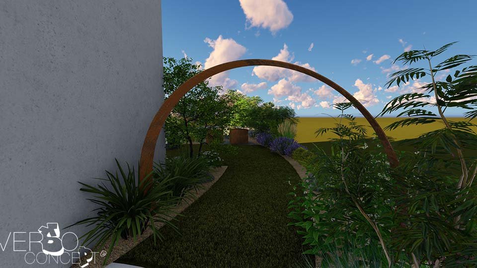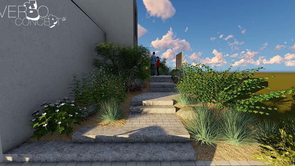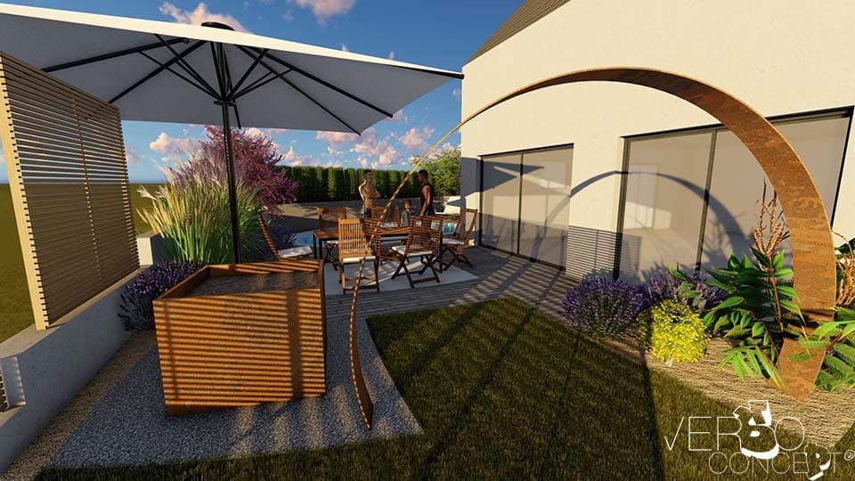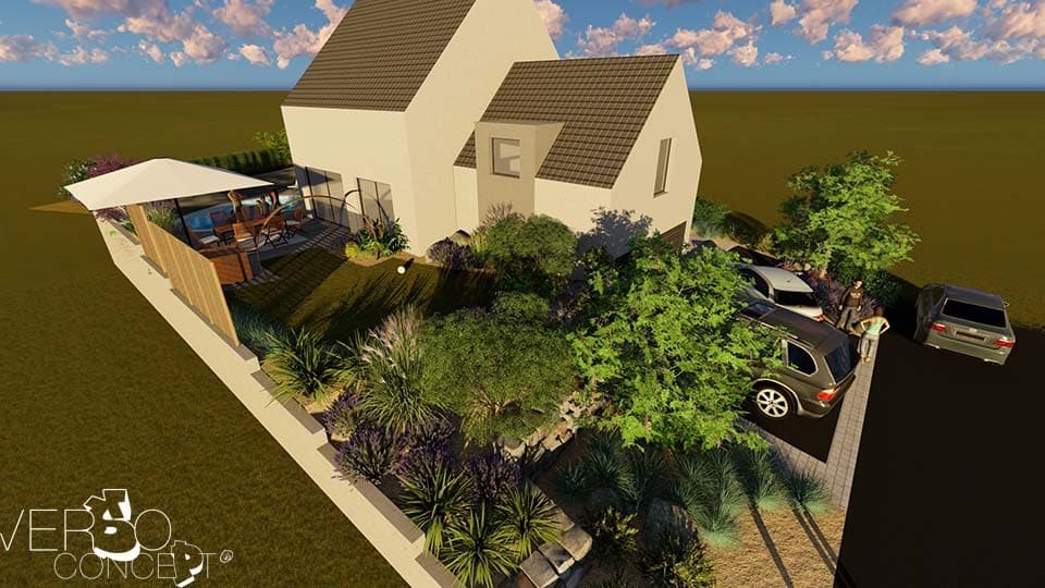 Imaginer une nouvelle manière de vivre son jardin en travaillant avec les éléments naturels inhérents au terrain tel qu’un dénivelé avant/arrière de plus de 190 cm.