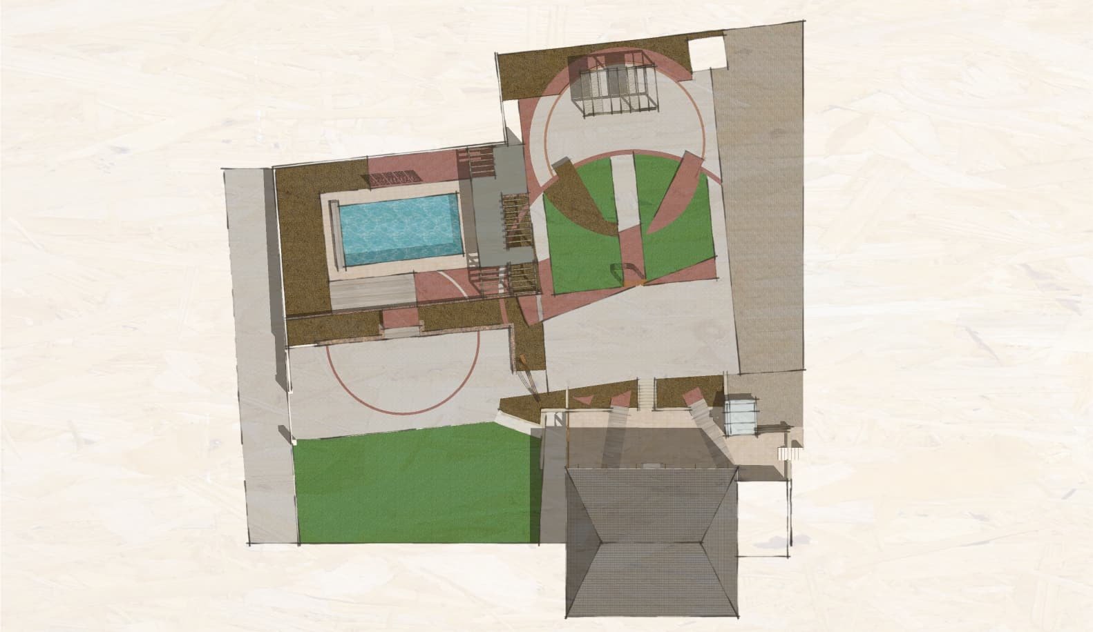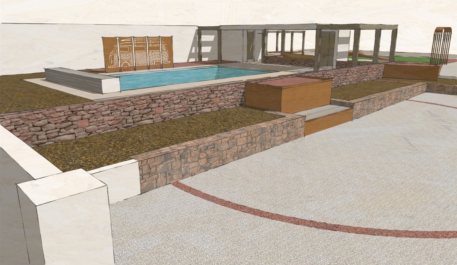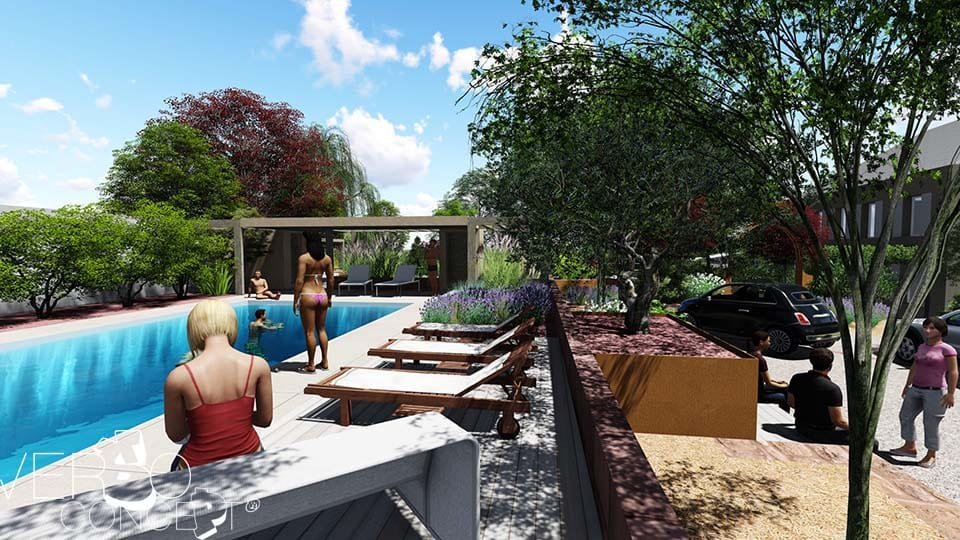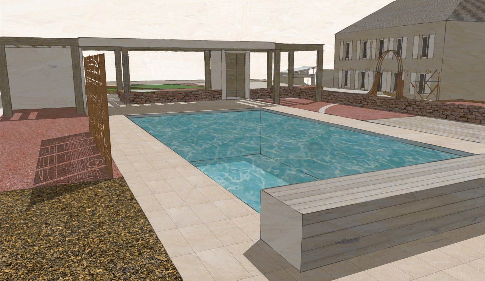 Proposition de création d’un espace de transition vers la zone piscine avec l’intégration d’un Pool-House dont la structure servira pour aménager des espaces de rangement/stockage, mais également à générer une ombre portée pour profiter encore mieux de cette surface de détente.