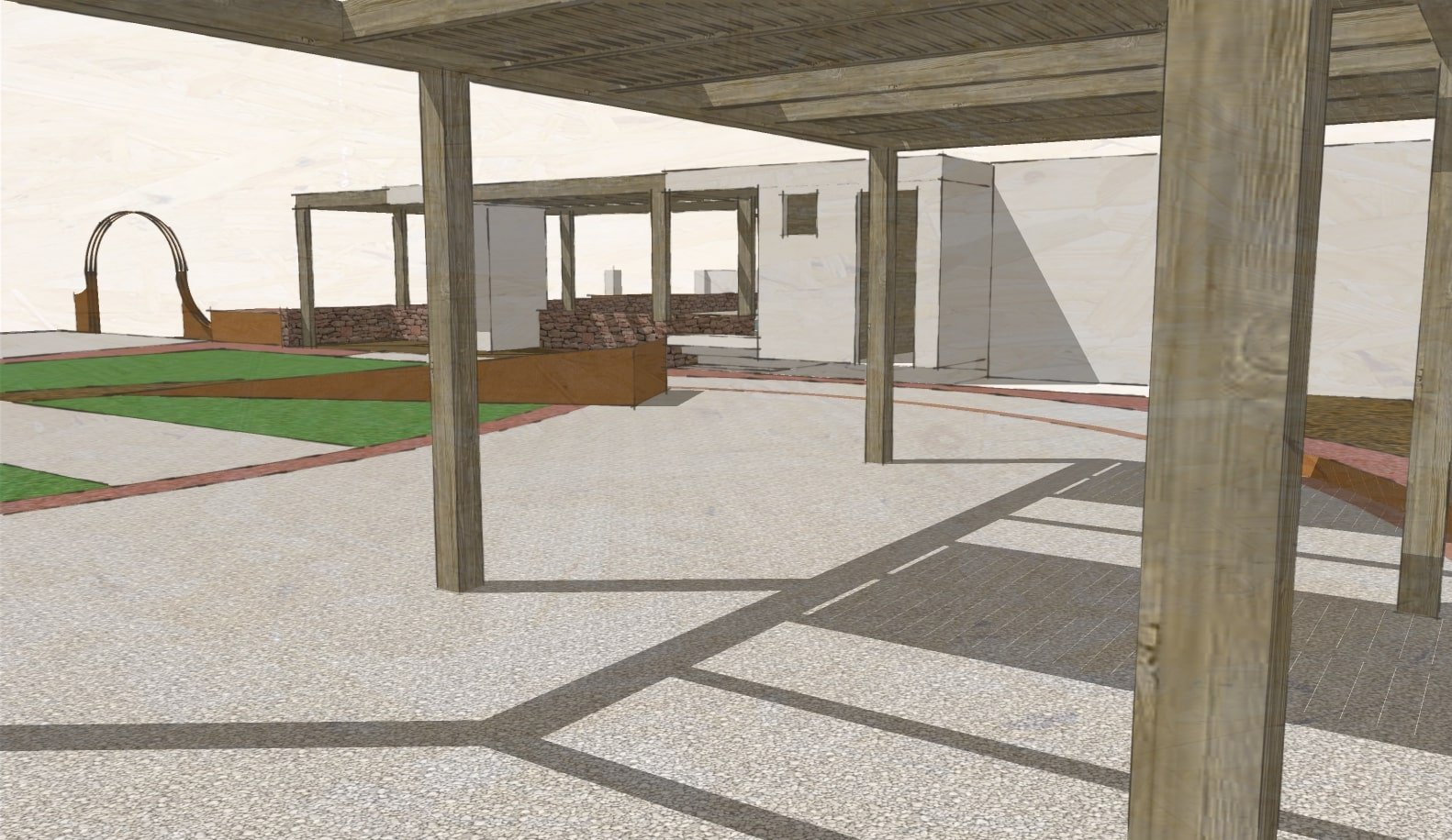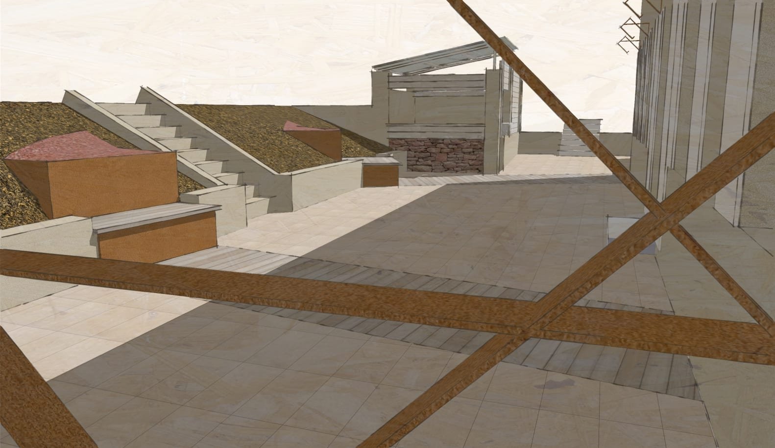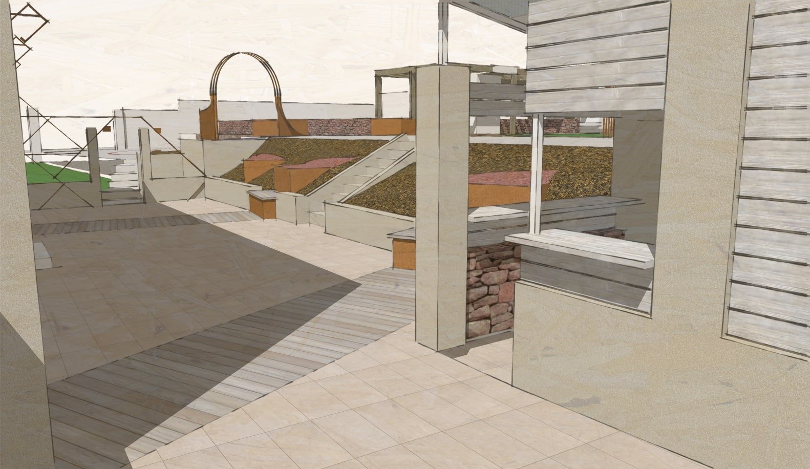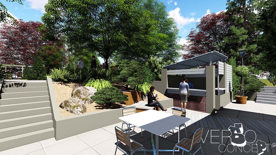 Insertion de structures banc/bac au niveau de la terrasse avec inclusion d’un revêtement bois dans la prolongation des axes de mise en place = apport d’un nouveau rythme graphique et de matière.