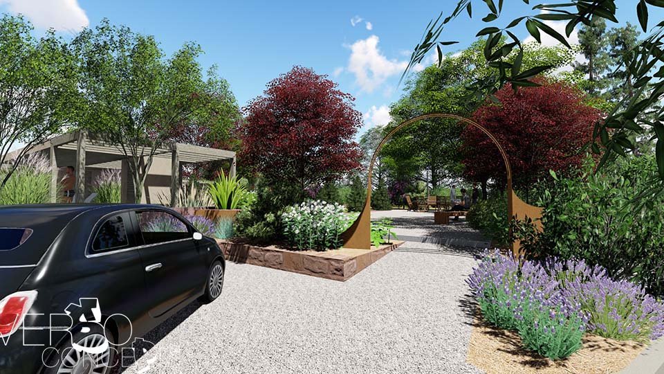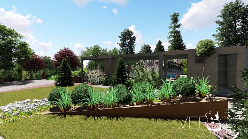 Utilisation de l’acier Corten comme fil rouge de l’environnement : arche | structure banc | structure de maintien pour plante grimpante | bac de plantation | délimitation | décoration
