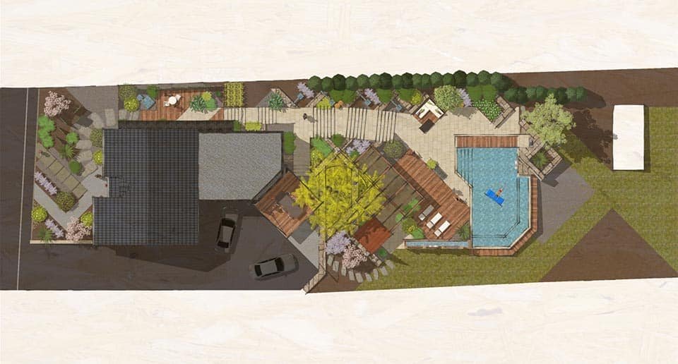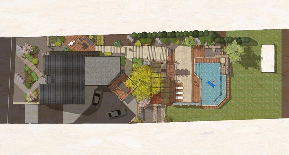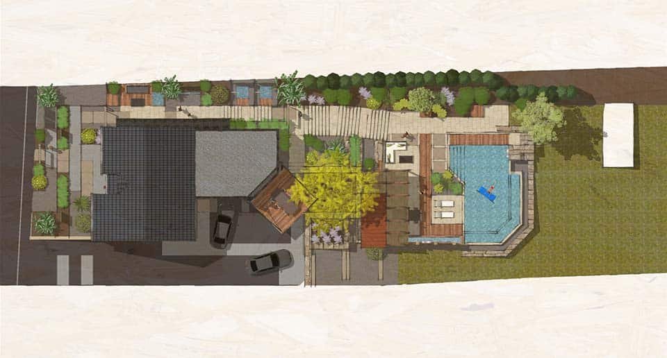 Valoriser la ligne directrice de la terrasse suspendue et harmoniser en fonction du bâtiment construit : changement d'espace = changement de rythme.