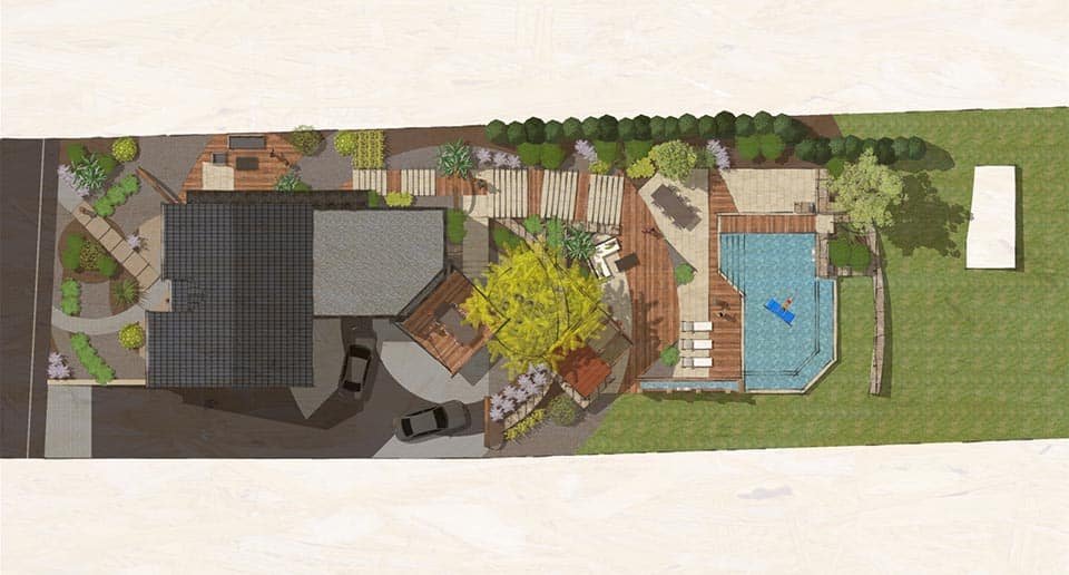 A l'aide d'une trame basée sur des cercles concentriques axés en 2 points importants de l'existant, mise en place d'une succession de courbes qui vont adoucir les espaces.
